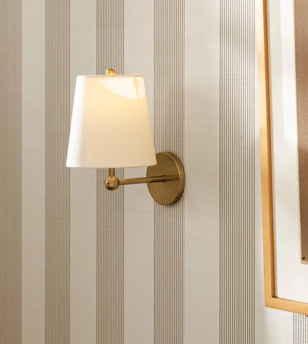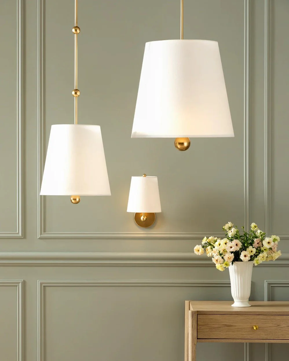 lighting collection consisting of large & small pendants, & a sconce. design is understated & contemporary with a simple ball finial motif. solid brass - linen shades.