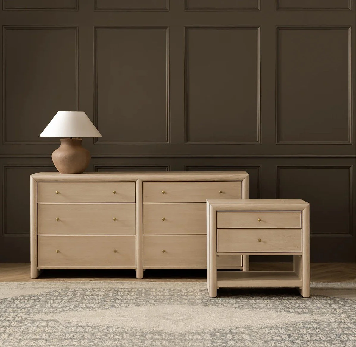 the top and sides of the tellerbeck collection feature a waterfall edge and a mitered corner, which work to highlight their classically-informed edge detailing & substantial proportions. bleached oak - solid brass pulls - updated traditional.