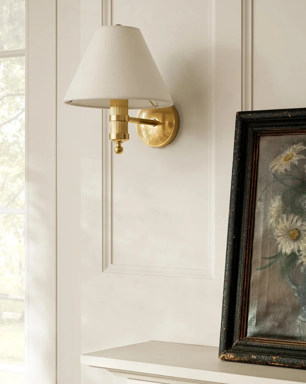 lighting collection consisting of a chandelier, pendant, sconce, & floor lamp. solid brass with linen shades. coining - subtle traditional detailing - contemporary silhouettes.