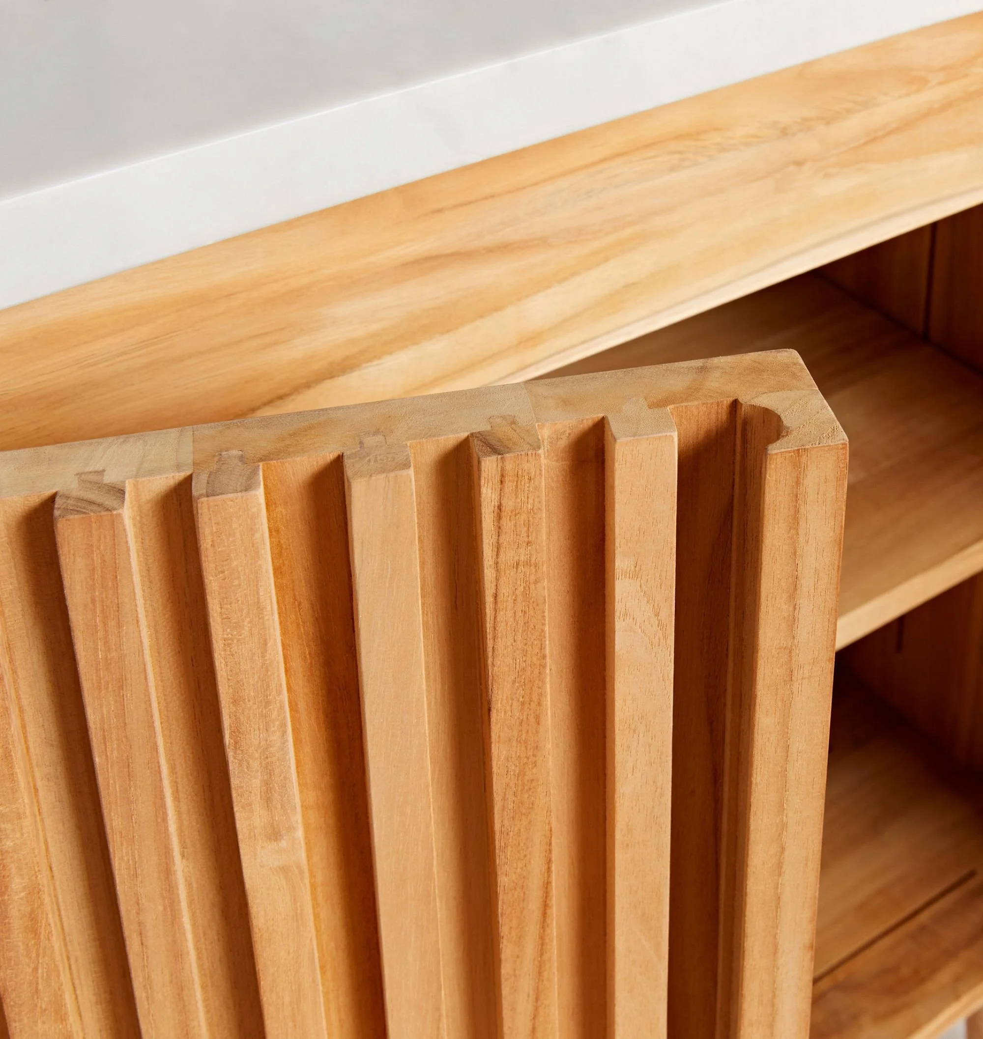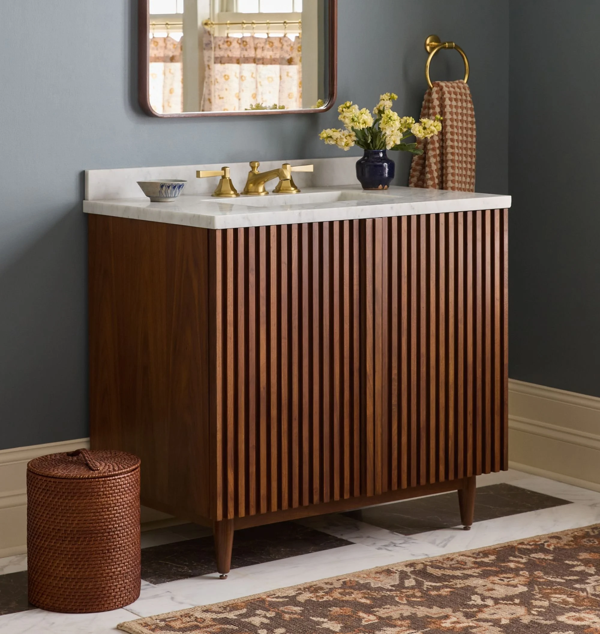 bathroom vanity collection in single & double configurations. doors feature a graphic vertical slat motif & integrated pull. contemporary & mid-century influences.